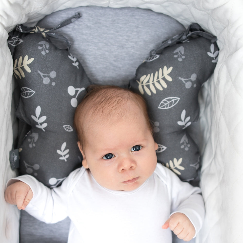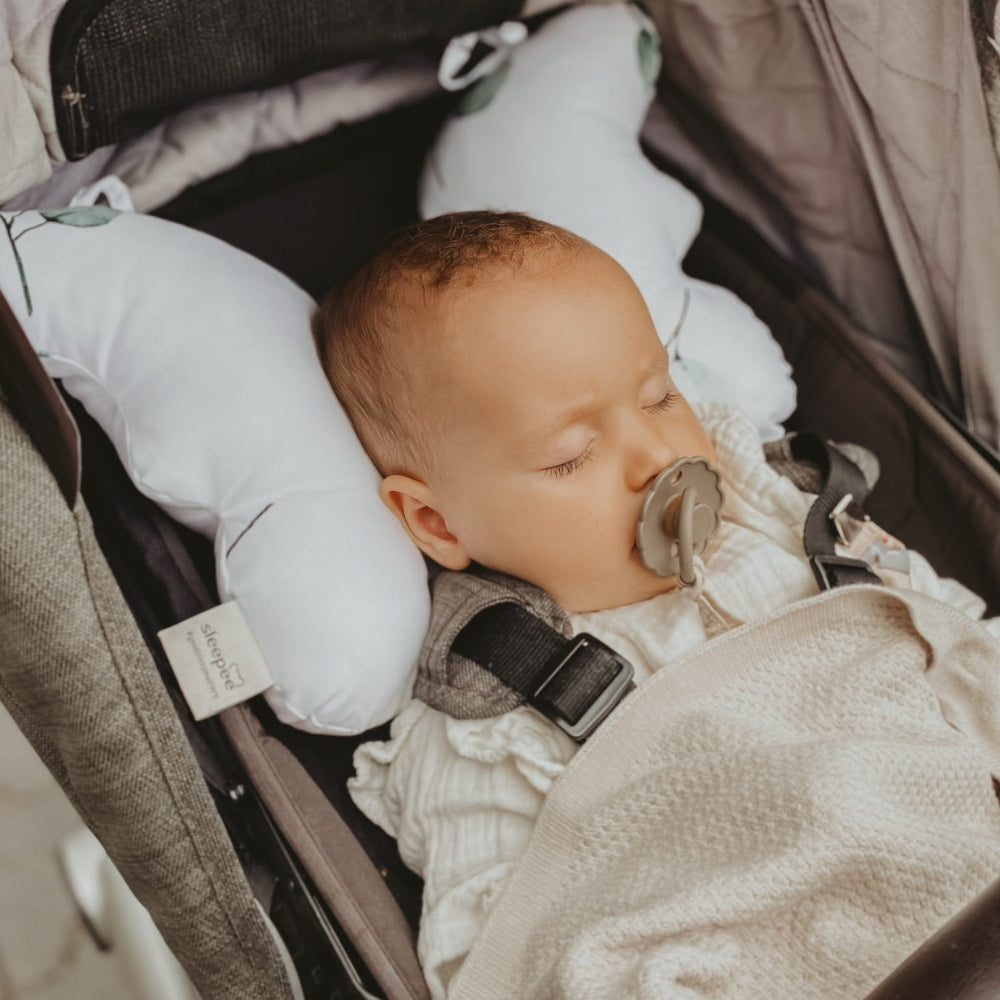 Sleepee babykudde har snören som kan knytas fast i bilbarnstolen eller spjälsängens steg för bättre huvudstabilisering.