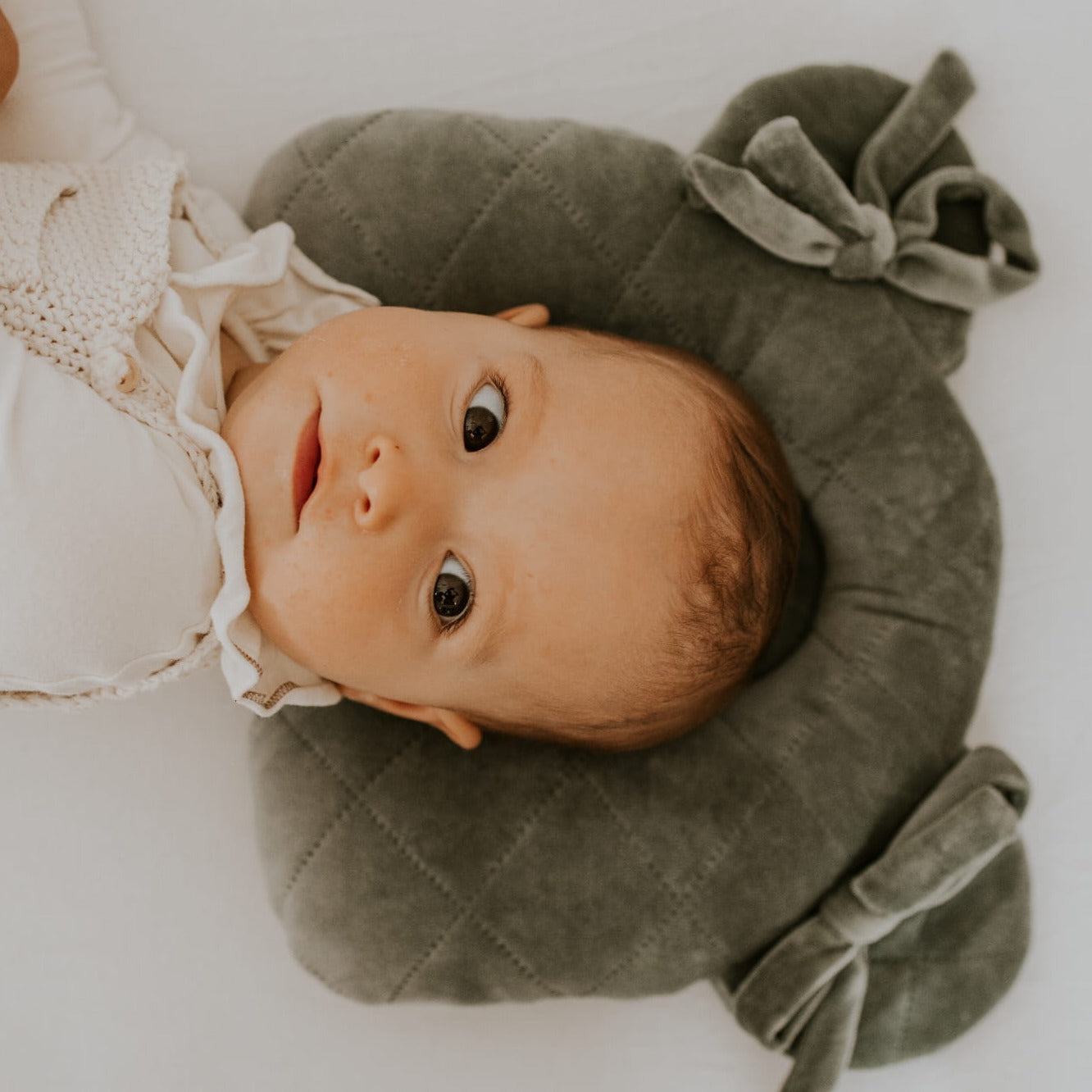 Sleepee-babykudden har också två band i hörnen som kan knytas fast så att den inte flyttar sig.