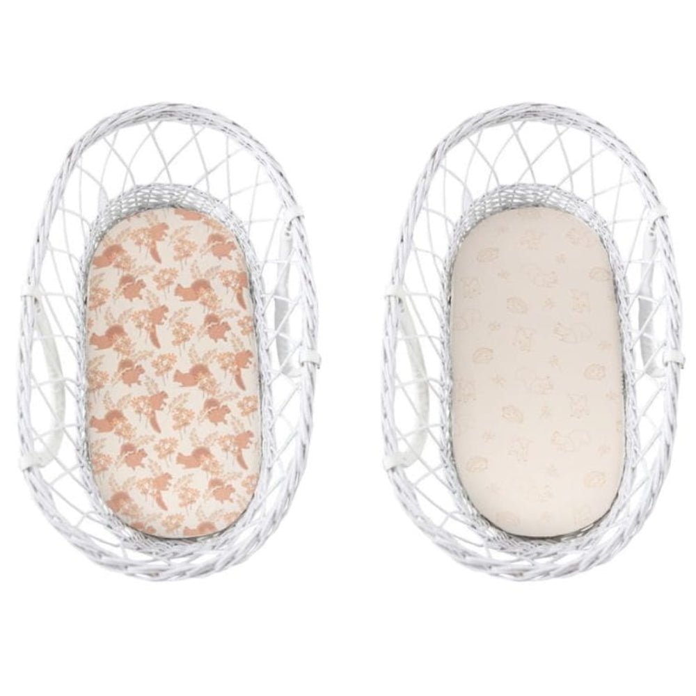 Setet innehåller två lakan tillverkade av högkvalitativ, tjock bomullstrikå med 8 % elastan, vilket gör dem extra mjuka, stretchiga och perfekta för alla babykorgar, moseskorgar eller vaggar.