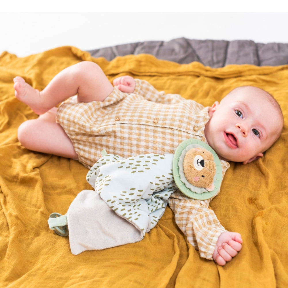 Det gosiga babylejonet levereras också med en bitring och napptagg.