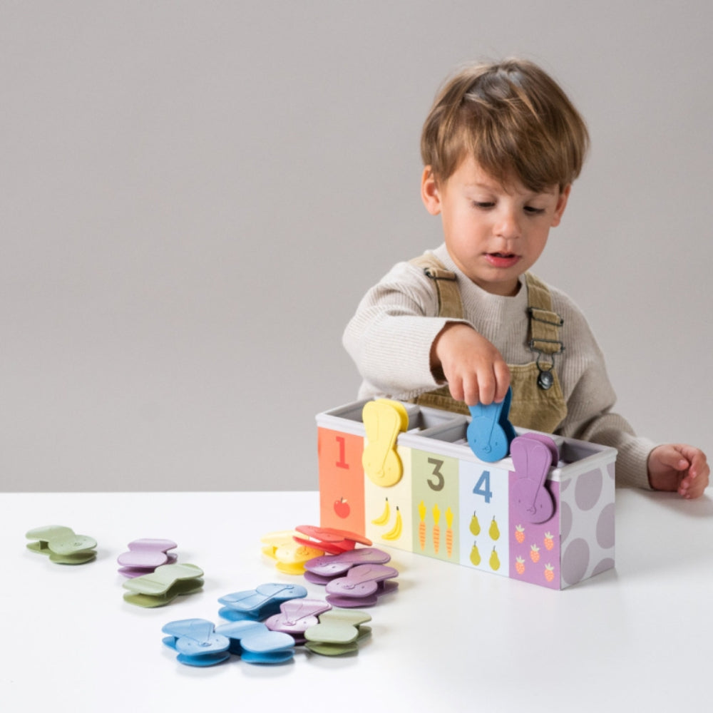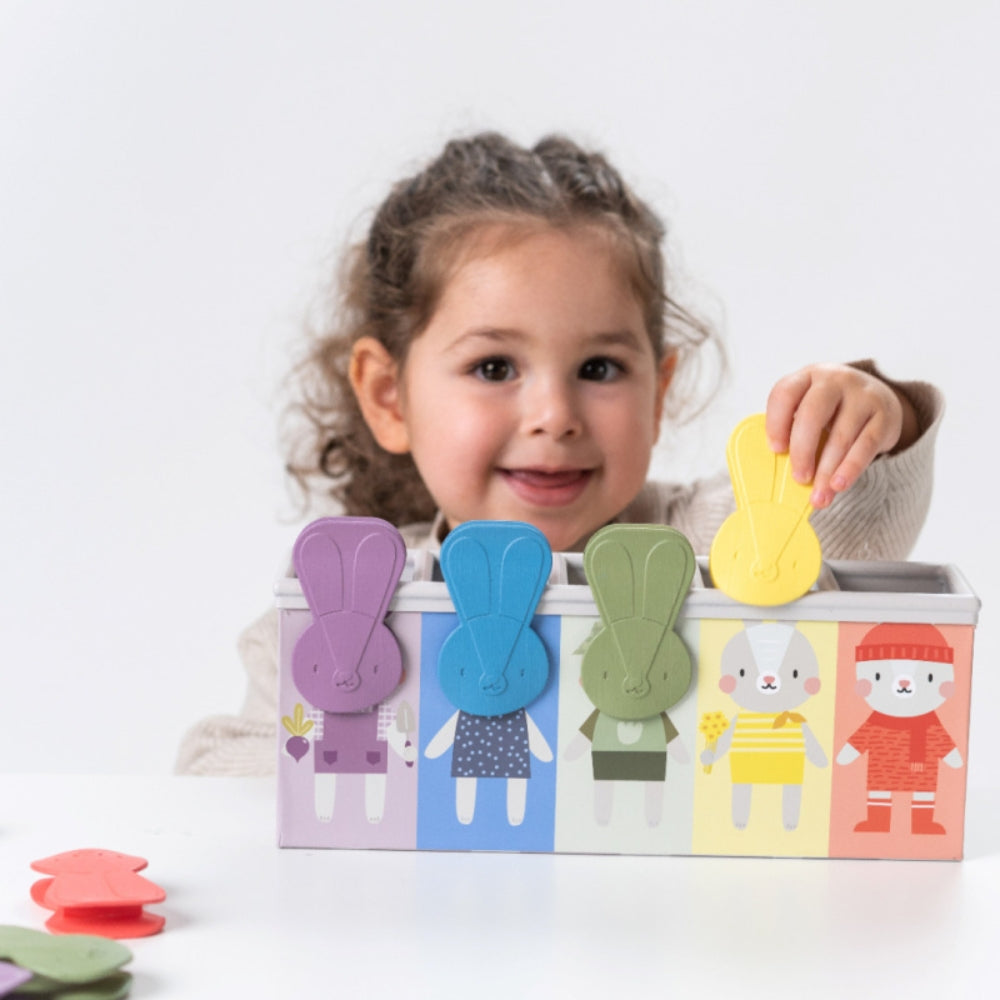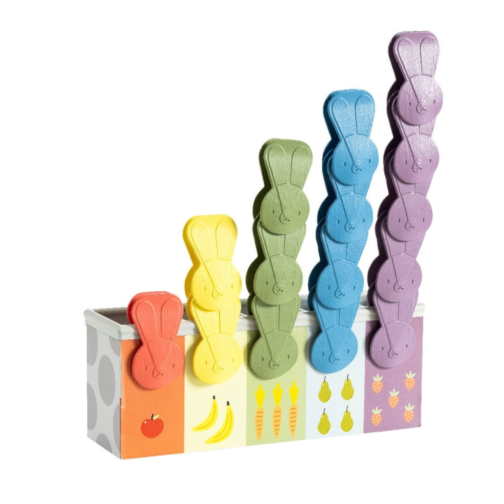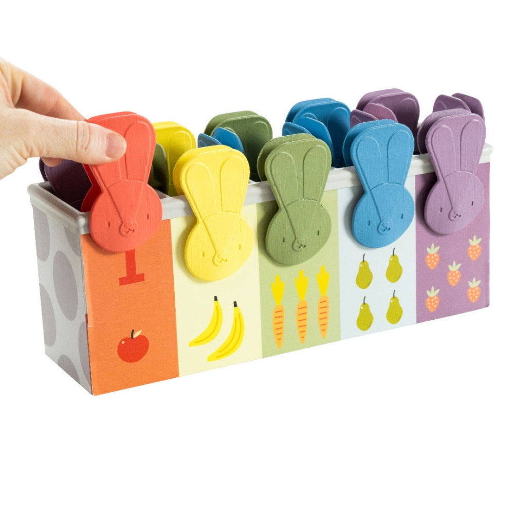 Satsen innehåller en vackert illustrerad låda och 15 kaninformade klämmor som ger ditt barn timmar av underhållning och lärande.