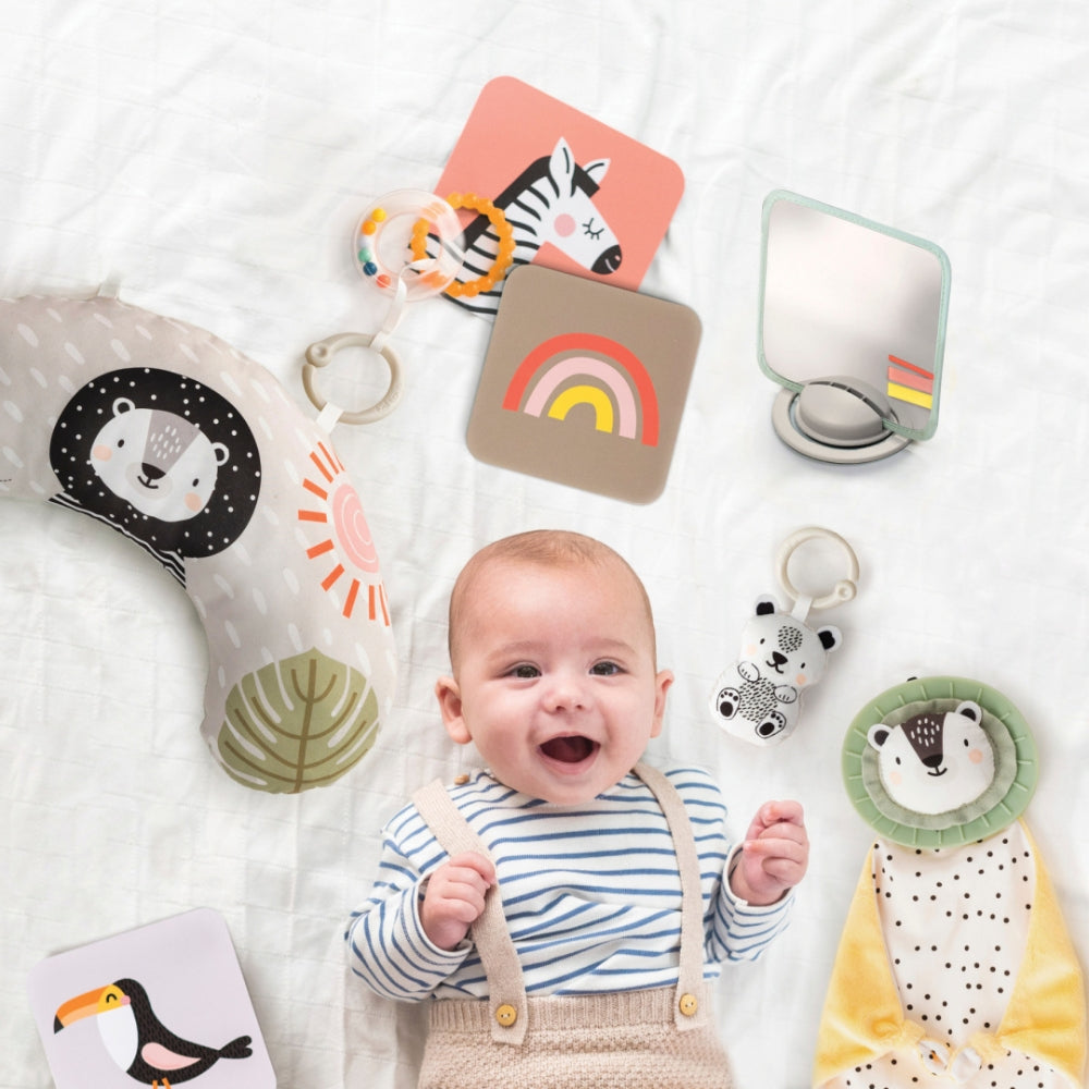 Leksakerna för nyfödda är perfekta för att ligga på magen, ge visuell stimulans, lära sig om orsak och verkan och känslomässig utveckling.