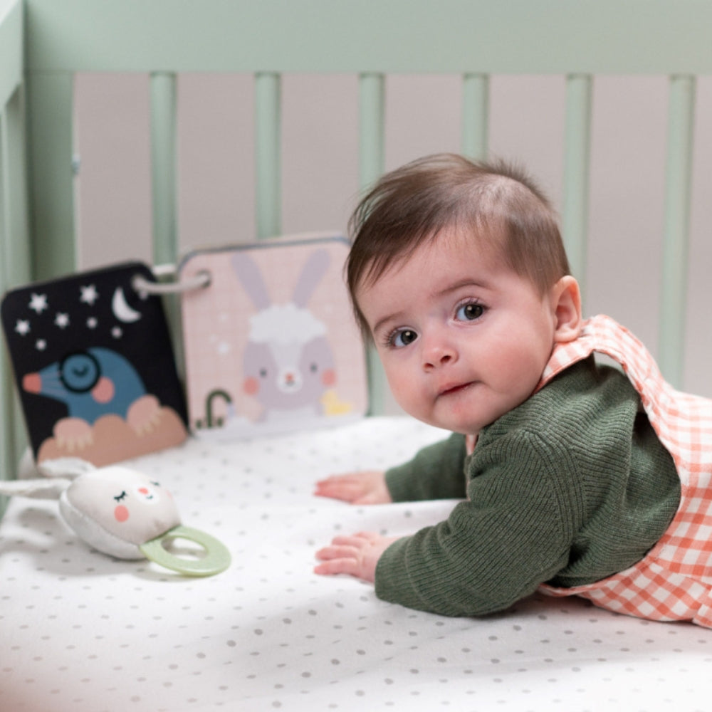 Ett set med 7 dubbelsidiga kort (14 bilder) och en kortring. De dubbelsidiga korten kan användas för att stimulera barnets ögon visuellt under dagen genom att visa kontrasterande bilder. På kvällen kan den andra sidan av korten användas för att berätta en mild, sömnframkallande historia. Den andra sidan av korten kan också användas för att berätta historien om kaninen och hans dagliga rutin, vilket gör den idealisk för de första stunderna med ett litet barn och hjälper till att lära ut enkla ord och handlingar.