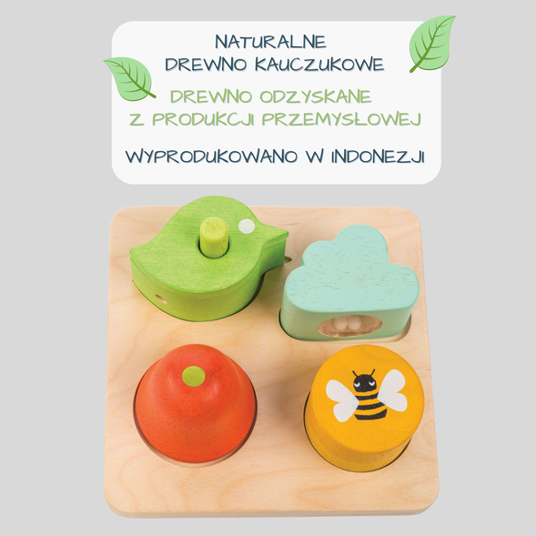 Det träpusslet består av fyra träbitar i olika former, såsom en fågel, ett moln, en klocka och en bi, samt en träbas.