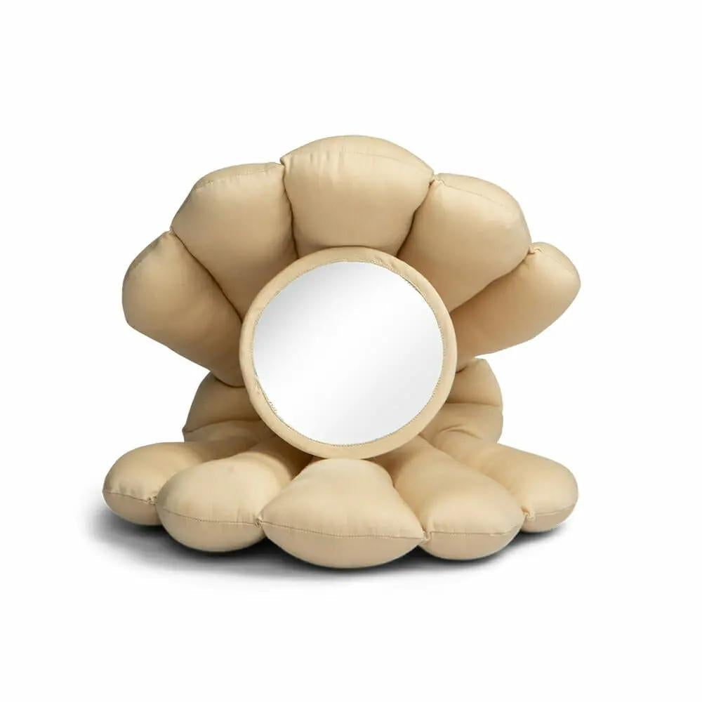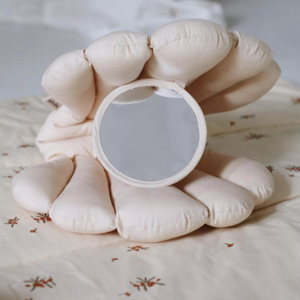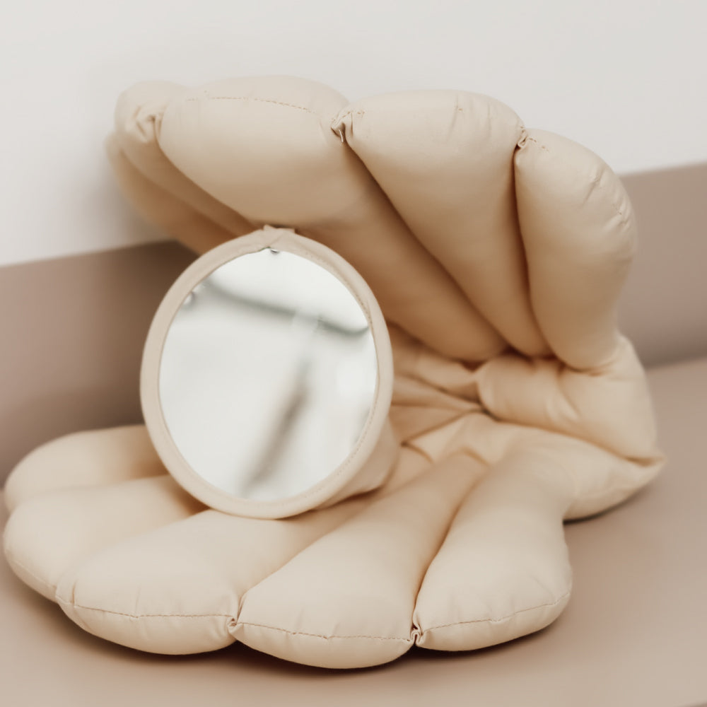 Den mjuka babyspegelkudden är i färgen beige.