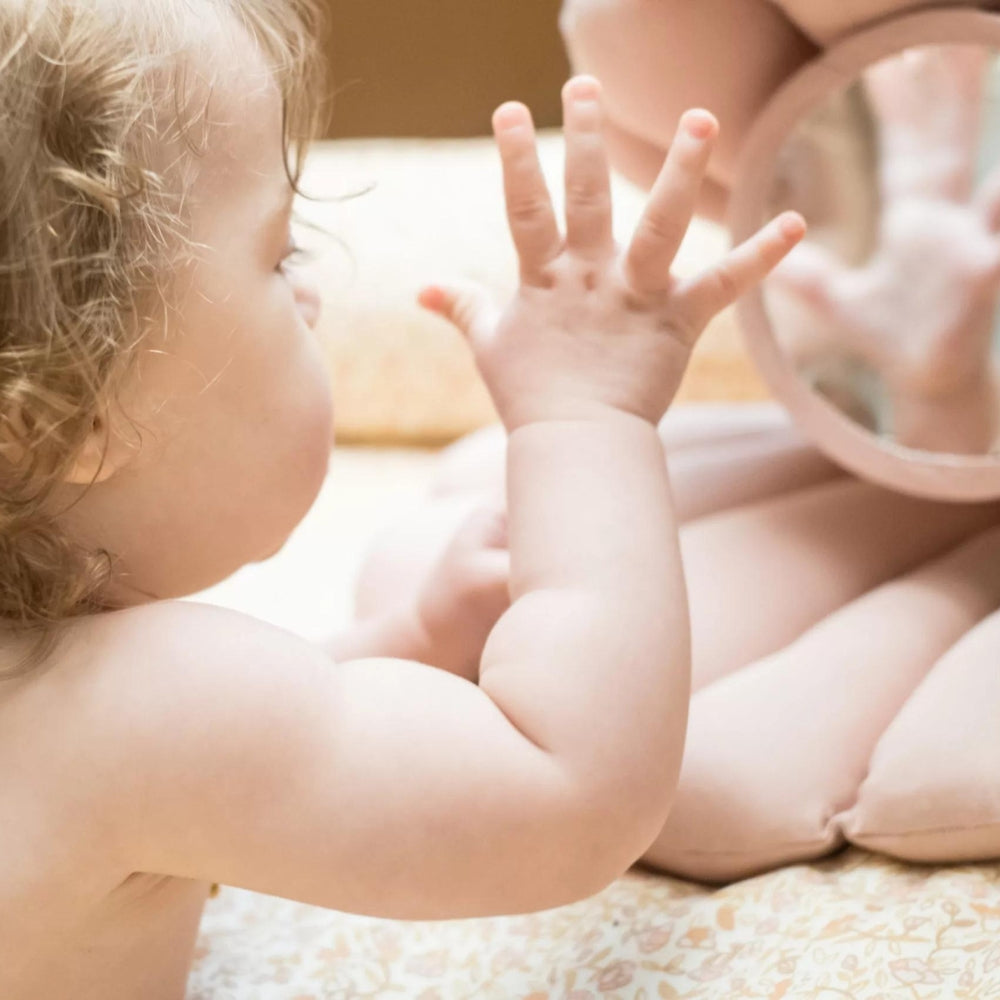 Den vackra babyspegel leksaken i rosa är perfekt för nackträning från That's Mine.