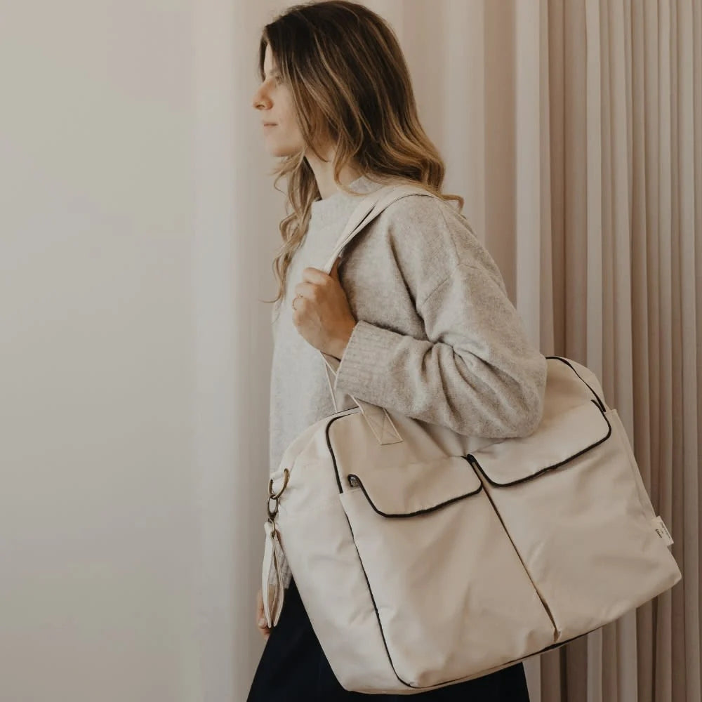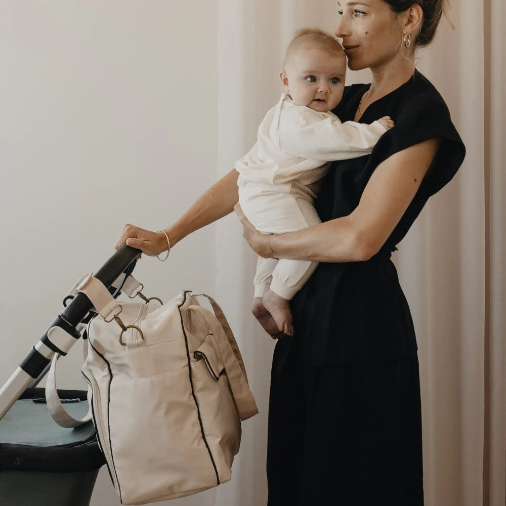 Mamma-väskan är skapad i samarbete med varumärket Élhée och kombinerar lätthet, elegans och praktiska lösningar för att underlätta vardagen med barn.