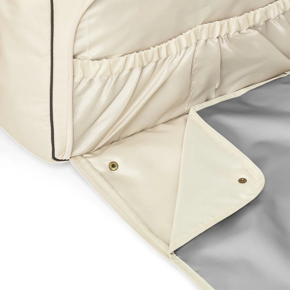 Den levereras också med en skötbädd, som förvaras i en stor ytterficka som enkelt kan tas bort, vilket ger extra utrymme för andra saker. Väskans insida har rymliga fack, inklusive en dubbel ficka med termofoder, perfekt för förvaring av mjölkflaskor eller drycker.