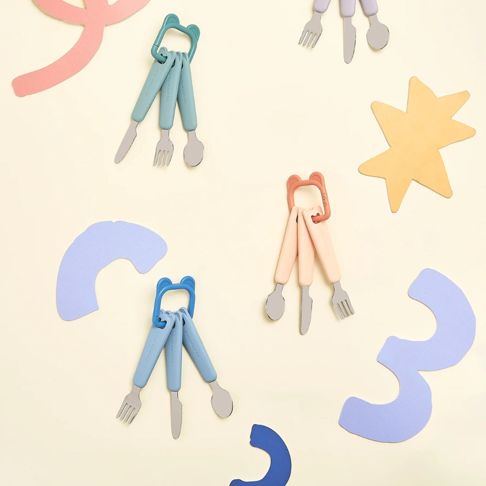 Den praktiska silikonöglan håller ihop alla delar, vilket gör barnbesticken lätta att packa ner i en lunchlåda eller väska.