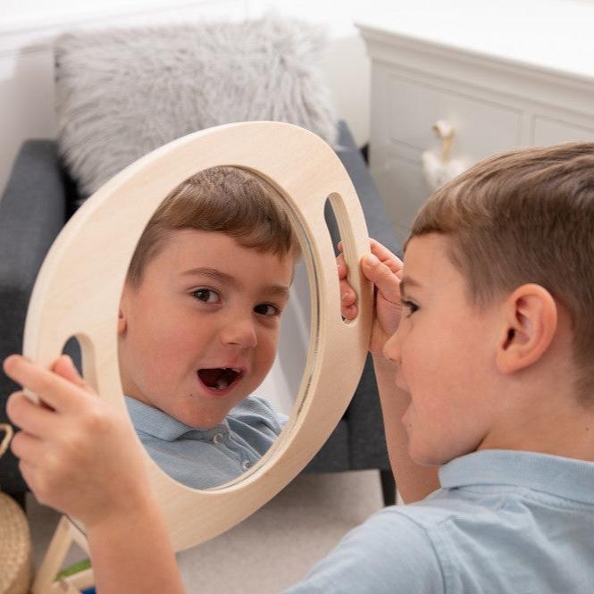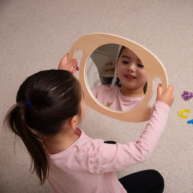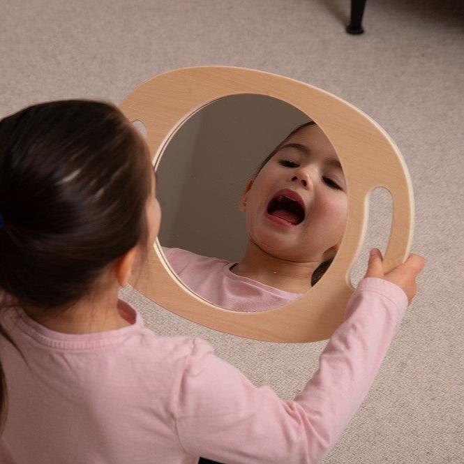 Handhållen akrylspegel för barn för självreflektion, gruppspel och rollspel tillsammans.