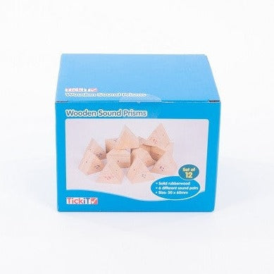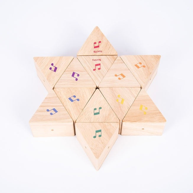 TickiT Träklossar för barn är en uppsättning med 6 par triangulära prismor av hårt trä som kan identifieras genom matchande musikaliska ljud.