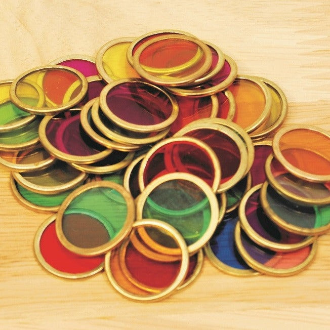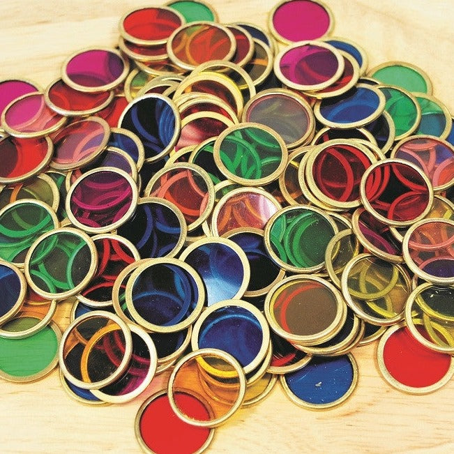 Färgglada transparenta brickor med metallkanter, perfekta att använda med magnetstavar.