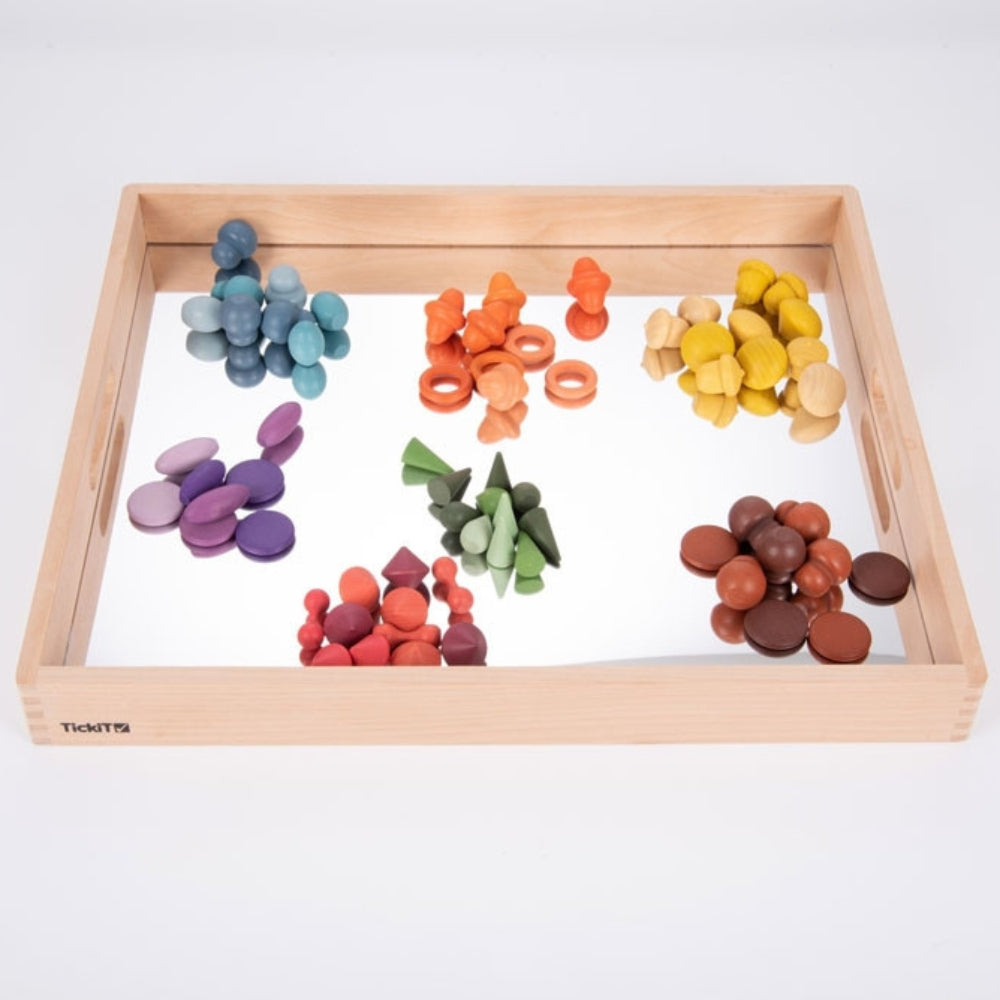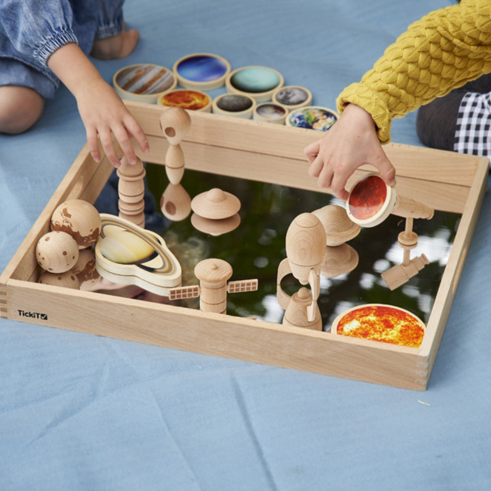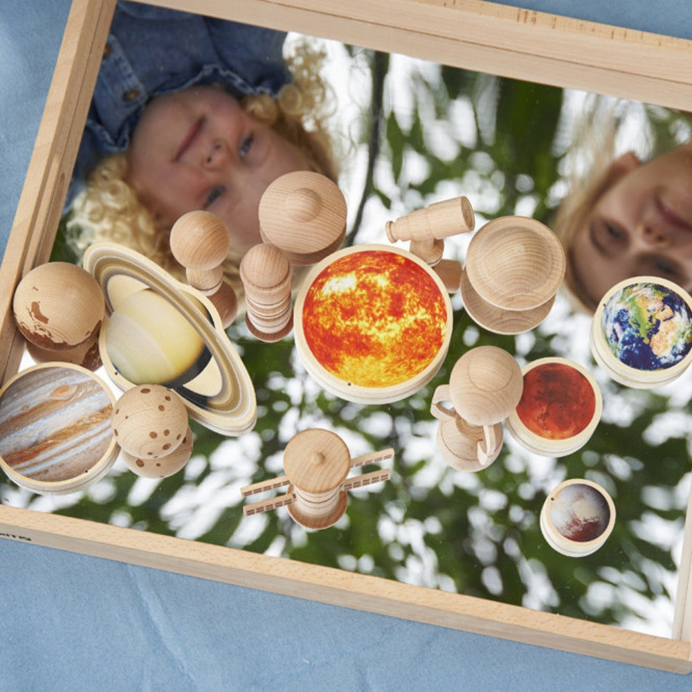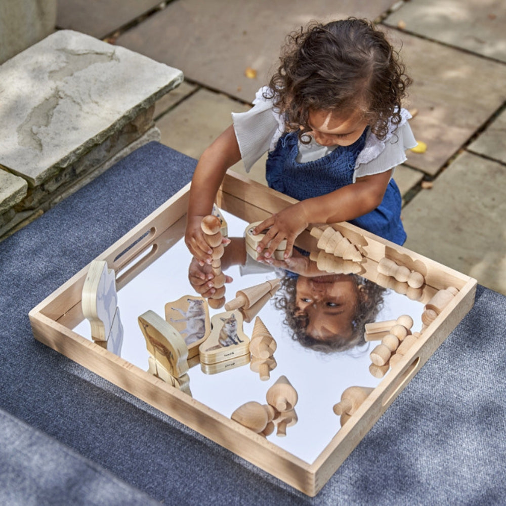 Spegelbrickan i massivt bokträ är perfekt för att lära barn om reflektioner och spegeleffekter, för att noggrant undersöka intressanta föremål, för fantasifulla lekar och för att skapa små världar.